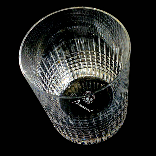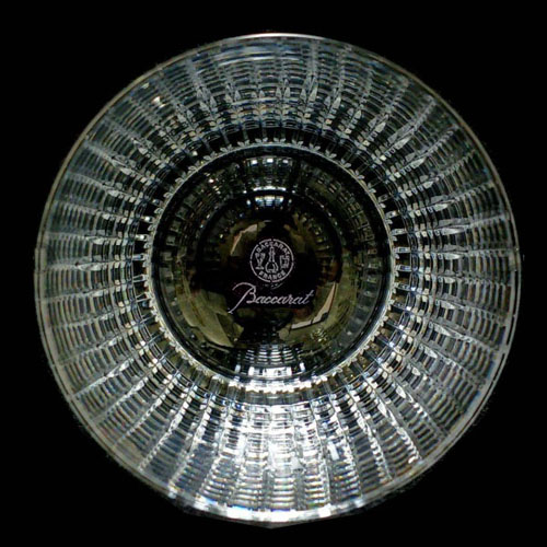 側面に刻まれた縦溝カットが底部外周に円形状に刻まれ中央部にバカラのロゴマークが見えます